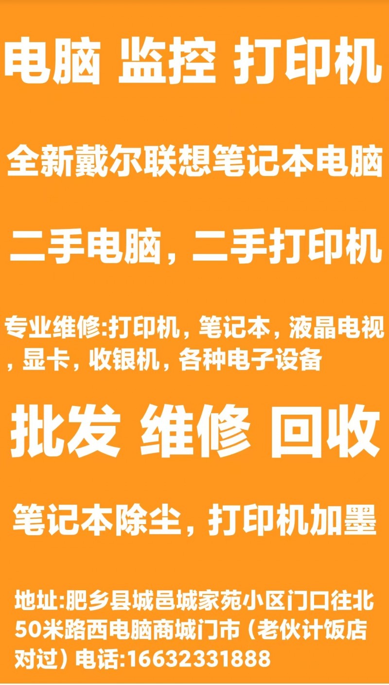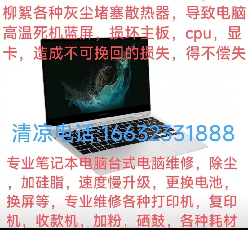 专业笔记本电脑台式电脑维修,除尘,加硅脂,速度慢升级,更换电池,换屏等,专业维修各种打印机,复印机,收款机,加粉,硒鼓,各种耗材。